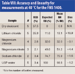 Table VIII: Accuracy and linearity for measurements at 40 °C for the FMS 1400.