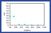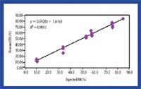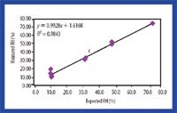 The ability of the FMS 1400 headspace-moisture analyzer to accurately measure relative humidity values close to 0% RH and 100% RH also was evaluated (see Table VI and Figure 6b). Five 50-mL clear vials containing USP water (with an expected relative humidity of 100%) and equilibrated at 40 °C were measured. The results (mean = 98.8%, RSD = 0.4%) suggested that the Lighthouse instrument can measuring up to 100% RH with a high degree of accuracy. At the low end, five 50-mL clear vials containing dried desiccants (with an expected relative humidity of 0%) and equilibrated at 40 °C were measured. The results (mean = 0.8%, RSD = 37.5%) suggested acceptable performance at the low end of the expected relative humidity range as well, although with less precision.