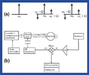 Figure 1: Principle and schematic of frequency modulation spectroscopy. Top figure (a) shows the frequency and intensity profile of a diode laser beam. Diagrams from left to right show an unmodulated, modulated with no absorption, and modulated with absorption by the upper sideband. Bottom figure (b) is a schematic diagram of an instrument for frequency modulation spectroscopy.