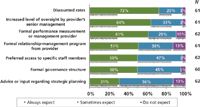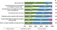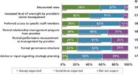 In the clinical service-provider surveys, respondents were presented with the same list presented in the sponsor surveys and asked about their perceptions of what sponsors always expected, sometimes expected, or did not expect of their preferred-provider relationships in the recent past (i.e., 2007–2009) and present or future (i.e., 2010 and beyond). Most providers said that, in the recent past, discounted rates were always expected, but all other items were expected only sometimes. Thirty-one percent of provider respondents felt that formal relationship-management programs were not expected by sponsors at all.