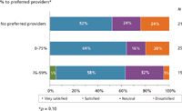 Differences between the groups were more pronounced when the value received for the money spent on clinical service providers was examined. Figure 5 shows that respondents from companies without preferred providers were far less likely to be satisfied with the value received than were respondents from companies with preferred providers, and the fraction that was satisfied increased with increased allocation of spending to these relationships. Likewise, only 5% of respondents from companies that allocated 75% or more of their clinical-outsourcing spending to preferred providers were dissatisfied with the value obtained, whereas 33% of those from companies without preferred providers were dissatisfied.