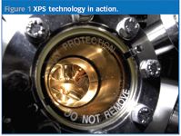 Sometimes chemical changes at the drug surface occur because an unprotected pharmaceutical product undergoes surface chemistry oxidation or hydration. Once again, surface analysis techniques are the ideal identification tools; for example, x-ray photoelectron spectroscopy (XPS) offers quantified data on elemental and oxidation state changes within the top 5–8 nm of a surface. The technique not only enables the overall level of oxygen (as combined in oxygen-containing groups) at the surface to be measured, but can also differentiate between the form of the oxygen — such as whether it is present as an acid, carbonyl, ester or alcohol. Figure 1 shows XPS technology in action.