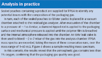Using the techniques outlined previously provides a clear picture of the form of attack the drug surface has suffered. The amount of tests available to troubleshoot potential product lifespan problems is immense, but with our data a likely candidate can be identified and the correct form of further analysis can be selected. In the case of atmospheric related symptoms, this further analysis usually takes the form of residual gas analysis (RGA). This technique has recently been refined for pharmaceutical packaging gas analysis (PPGA) to allow intact pouches or blister packs to be studied. Similarly, modified RGA analysis can also be used to study entrained bubbles of contaminated gas to identify a likely contamination source.