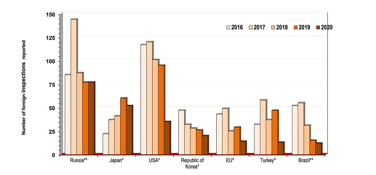 Trends in the number of reported foreign inspections are summarized in Figure 2. While the member of foreign inspections performed by Russia and Japan are constant all other inspectorates reduce the number of foreign inspections in 2020.