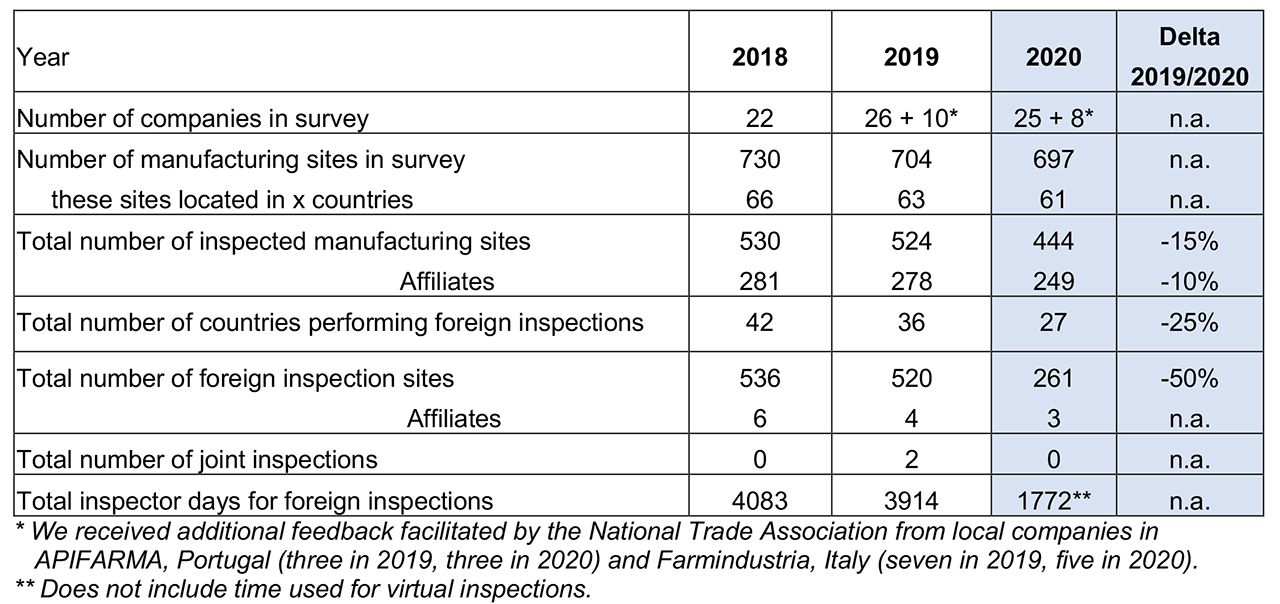The COVID-19 pandemic caused a significant reduction in the number of inspections in 2020, but there was no discernible drop in oversight of manufacturing facilities ensuring that industry maintained high standards of quality, safety, and efficacy of medicines. The authors feel that lessons learned from this year’s survey could be permanently implemented, in compliance with existing legislation (9).