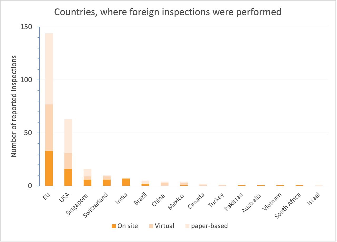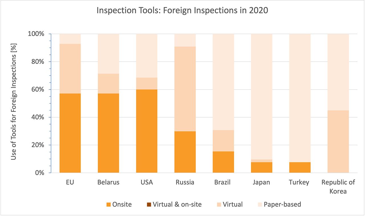 Virtual presence. The virtual (‘remote’) tool offered a logical alternative for inspectorates mostly adopted for performing foreign inspections in 2020 (6,7). Implementing this tool varied: it was used, for example, mainly by EU inspectorates (which employed virtual and on-site tools in 50:50 ratio), Republic of Korea, and Russia (Figure 4).