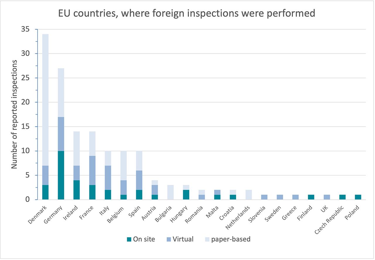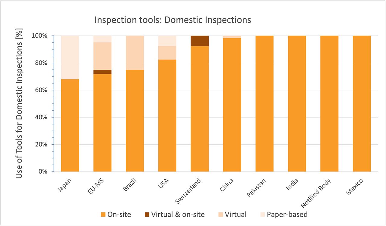 Some inspectorates used a hybrid approach, with a combination of on-site presence and the virtual tool. This combination was used mostly for domestic inspections (Figure 2). Use of the virtual tool alone was reported for domestic inspections by EU inspectorates (including Belgium, France, Germany, Ireland, Poland, and UK), the US, and Brazil.
