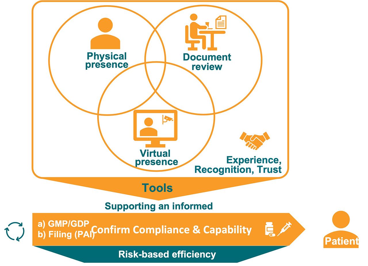 In 2020, the pandemic revealed the range of tools available to inspectorates and the flexibility offered by the toolbox for conducting inspections using physical presence, document review, virtual presence, and experience, recognition, and trust. Implementation of these tools confirm compliance and capability implementing efficient risk-based approaches (Figure 3). Inspectorates used a variety of tools stand-alone and in combination (4). The tools are not equivalent for the knowledge gained and trust applied. Each approach has challenges and opportunities.