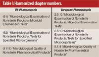 The format of the USP chapters changes dramatically with this harmonization. Whereas the Microbial Limits Tests were two chapters in the USP 29 (5, 6), they are now modified in the harmonized version to mirror the European format (see Table I).