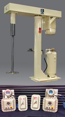 The dispersers’ control panel features start, stop, and emergency stop pushbuttons; a speed potentiometer; digital readout for agitator speed; and a 16-ft. grounding clamp device. Also supplied on the mixer are explosion-proof limit switches for locking out the motor if the blade is in a raised position or a mix vessel is not in place. The dispersers are available in sizes from 1 to 500 HP for batches from a gallon to more than 5000 gallons.