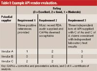 An example of such a table for the evaluation of an active pharmaceutical ingredient (API) supplier is shown in Table I. Once the ratings are assigned, a simple average can be used to determine the best overall option. Keep in mind that this is not the final step in the process. The Evaluation Phase has only identified and documented the best potential vendor.