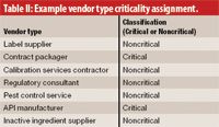 The next-to-last phase in the vendor qualification process involves a site audit of the potential vendor's facility. As the cost of an audit is a potentially pricey activity, the site audit maybe performed onsite or offsite depending on the criticality of the potential vendor type and is limited to the best potential vendor identified in the Evaluation Phase. Vendor types need to be divided into critical and noncritical suppliers. A critical vendor is one that supplies goods or services that directly controls or dictates the quality and integrity of pharmaceutical and biopharmaceutical products. A noncritical vendor is one that supplies goods or services that assist and support the quality of these products. As the interpretation of the definitions of critical and noncritical suppliers varies among companies, it is imperative that an approved and controlled company document (or documents) clearly defines which vendor types are deemed critical and which are deemed as non-critical. Examples of critical and noncritical vendor types are listed in Table III.