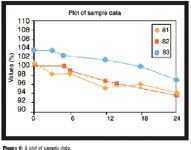 Assume the data in Table I were obtained. A plot of these data is given in Figure 6. The columns of the data show how to calculate the points to be considered in the histogram. For example, for Batch 1, the change from previous method for the 12-month point is –3.1 (95.3 – 98.4); the change from previous (per unit of time) method for the 12 month point is –0.52 ([95.3 – 98.4] 4 6] if the units used is months; and the change from initial method for the 12 month point is –5.4 (95.3 – 100.7). The observed value method does not require any manipulation before evaluating the distribution. Thus the 12-month value is 95.3.
