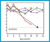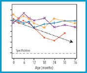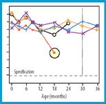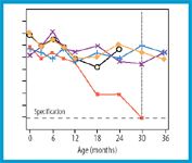 Figure 2: A process control alert (theoretical data, see endnote). Results from multiple time points for a study do not follow the same trend over the 36-month shelf-life expiration as do other studies. The study is not expected to fall below the specification limit through the 36-month expiration.