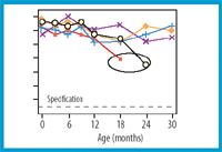 Figure 5: A compliance alert (theoretical data, see endnote). After two analytical alert results in a study, a result is observed right on the specification limit at the 30-month expiration time point. Because this study may represent many other batches, it is a potential compliance concern.