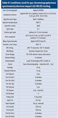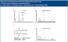 The LC/MS Q-TOF experiments indicated that the unknown was potentially identifiable as diisodecyl phthalate, which is volatile and thermally stable enough to be detected by GC/MS. A potential problem associated with GC/MS testing, however, was the fact that, if the unknown proved not to be DIDP, it might not be sufficiently volatile to be detected by GC/MS.