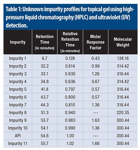 This case study used the following analytical instrumentation and techniques to identify an unknown impurity that was detected during routine release testing of a topical gel drug product. The impurity was detected by a validated HPLC/UV method with a known impurity profile (Table I) and was out of specification for the product. The following analytical methods were used: