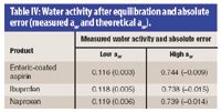 Accuracy. Accuracy at equilibrium is assessed by comparing the water activity of equilibrated samples with the theoretical water activity (the RH to which the sample was equilibrated using a controlled humidity chamber). Samples were equilibrated over the same type of saturated salt solutions used to calibrate the instrument. This approach was evaluated with an enteric-coated aspirin tablet and two other tablet formulations as shown in Table IV with a general accuracy of 0.01–0.02 aw . The same approach was taken by Mahajan et al., with a similar degree of accuracy (17). As previously mentioned, a 30-minute equilibration time generally has been adequate for capsules and tablets.