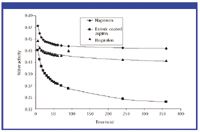 For most solid oral-dosage forms, the range of interest for water activity is 0.30–0.75. Water-activity measurements are generally precise and accurate to 0.01–0.02 units. Thus, water activity should be capable of providing 23 levels ([0.75 – 0.30]/0.02) of distinction over this measurement range. Several examples of degradation as a function of water activity are shown in Table I, and water activity changes of about 0.1–0.2 are needed to double the degradation rate. In a case for which a 0.1 change in water activity is critical, tighter controls of calibration may be needed. In general, the water activity would be controlled at a level well below when significant degradation occurs. Thus, the examples in Table I represent mostly the worst cases in terms of required accuracy. Compared with Karl Fischer water testing, water activity has particular advantages when: