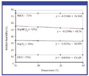 Figure 3: Relative humidity as a function of temperature for saturated salt solutions used for calibration (only the magnesium nitrate standard is sensitive to temperature).