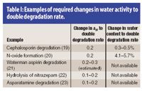 The importance of water activity in controlling the microbial properties of pharmaceutical products was added to US Pharmacopeia (USP ) Chapter ‹2023›, "Microbiological Attributes of Nonsterile Nutritional and Dietary Supplements," and a new USP chapter was written: ‹1113›"Application of Water Activity Determination to Nonsterile Pharmaceutical Products." USP Chapter ‹1113› primarily describes the application of water-activity measurement for the control of a nonsterile formulation's microbial attributes, but also mentions the control of chemical degradation. The correlation of water activity and chemical changes in food also has been investigated extensively (10). A correspondingly common practice in pharmaceutical development is to equilibrate products at different humidities (water activities) and study their degradation rates. Water activity also correlates with changes in chemical and physical stability (11, 12). The degradation rate of several pharmaceutical products is well modeled by water activity using the BET function (rate is proportional to 1/[1 – aw ]) (11) as well as other approaches (12–15).