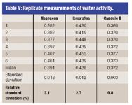 Over-the-counter tablets of ibuprofen, naproxen, and enteric-coated aspirin were obtained from a local retail establishment for evaluation. Two developmental capsule formulations also were evaluated. Capsule A was a starch-based formulation and Capsule B contained enteric-coated beads. The water-activity instruments used were from the same manufacturer (Novasina, Pfäffikon, Switzerland) but obtained from Omnimark Instrument Corp. (Tempe, AZ). The names of the two models are the Ms1 and the AW Lab.