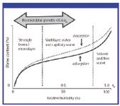 When water interacts with solutes and surfaces, it is unavailable for other hydration interactions. The term water activity (aw) describes the (equilibrium) amount of water available for the hydration of materials. Water activity is unitless and a value of unity indicates pure water, whereas zero indicates the total absence of water molecules. Water activity is the effective mole fraction of water, defined as: aw = λw xw = p /p0 in which λw is the activity coefficient of water, xw is the mole fraction of water in the aqueous fraction, p is the partial pressure of water above the material, and p0 is the partial pressure of pure water at the same temperature (i.e., the water activity is equal to the equilibrium relative humidity [ERH]), expressed as a fraction. The relationship between water activity and weight percent water is shown in a sorption isotherm (see Figure 1). Figure 1 also shows the hysteresis observed when the sorption isotherm depends on whether the water is added to the dry material or removed from the wet material. This hysteresis is caused by nonreversible structural changes and/or kinetic effects.