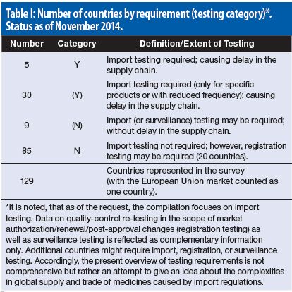 Categories of re-testing in the country of destination. Apart from re-testing associated with the import of pharmaceutical products, other testing categories were reported. Re-testing may be performed by companies themselves, contractors, and/or governmental laboratories in each country. The different categories of local re-testing reported and their impact are described subsequently: