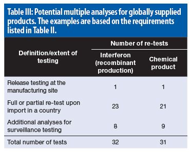 Multiplication of tests along the global supply chain. Multinational manufacturers manage global product supply chains. One drug product batch may be dispatched to several countries (i.e., batch splitting) after country-/region-specific packaging. Accordingly, the same batch may undergo several re-tests. Table III provides examples for a recombinant interferon and a chemical product.