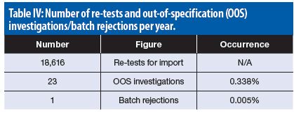 Quality-control figures. The survey collected annual data on the number of re-tests (full or partial), OOS investigations, and batch rejections. Six companies reported a total of 18,616 re-tests performed per year. Of these, one re-test resulted in a batch rejection. The overall figures are shown in Table IV.