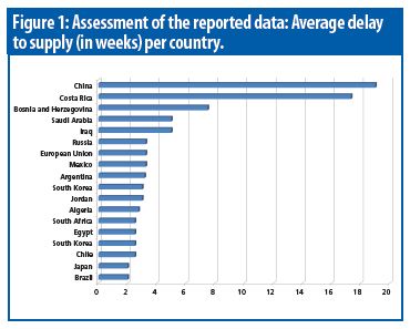 Delay to supply. The local re-testing process takes significant time. Information from 29 operations in 18 different countries was received. The average supply-chain delay is summarized in Figure 1 and ranges from two to 19 weeks. The maximum absolute delay was reported as 22 weeks (such as biologics testing in China). It is noted that re-testing can be further prolonged in case of OOS investigations or other delays (e.g., if required materials/reagents are temporarily not available due to import procedures).