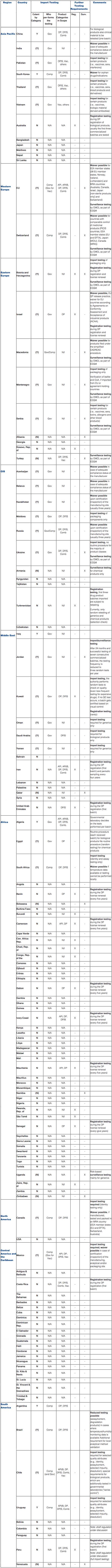 A special situation exists in Chile, where two local sets of re-tests are required for the import of biological products (4). In addition to the partial re-test under the responsibility of the importer/manufacturer, the products are subject to testing at governmental laboratories, referred to as “series control.”