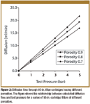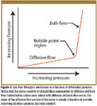 The knee area of the curve is where the influence of the bubble point is manifested. Here, the largest pores of the filter become unblocked as the applied pressure overcomes the capillary forces within those pores, and bulk flow begins to increase the slope of the curve. It is also in this region that diffusive flow begins to increase because the thickness of the liquid trapped in the largest pores begins to decrease as a result of the increasing pressure differential. Therefore, within the knee area of the curve a complex relationship exists between diffusive and bulk flow, both influenced by the pore structure and pore-size distribution.