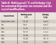 Table II: Melting peak (°C) and Enthalpy (J/g) for untreated ibuprofen raw material and the crystal modifications.