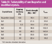 Table III: Tabletability of raw ibuprofen and modified crystals.