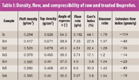 Table I: Density, flow, and compressibility of raw and treated ibuprofen.