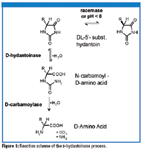 The hydantoinase process was introduced in the 1970s for producing D-amino acids such as D-phenylglycine and p-OH-phenylglycine (7). Today, > 1000 tons of each of these amino acids are produced annually. They are used as side chains for the -lactame antibiotics ampicillin and amoxicillin.