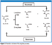The starting materials in the acylase process are N-acetyl-D,L-amino acids, which are chemically synthesized by acetylation of D,L-amino acids with acetyl chloride or acetic anhydride in alkali in a Schotten–Baumann reaction (21). The enantiomerically pure L-amino acids are formed by a kinetic resolution reaction of this racemic mixture wherein only the N-acetyl-L-amino acid is deacetylated. This reaction is catalyzed by a stereospecific L-acylase from Aspergillus oryzae and produces the L-amino acid, acetic acid and N-acetyl-D-amino acid. After separation of the L-amino acid by crystallization, the remaining N-acetyl-D-amino acid has to be racemized by physical or chemical means under severe conditions (high temperature, low pH) to form the N-acetyl-D,L-amino acids and will be used for a next cycle of the process (see Figure 3). The use of a D-specific acylase would also make D-amino acids accessible. It has to be pointed out that the enzyme catalyzed kinetic resolution produces a yield of only 50% referring to the staring material. The recycling procedure is a fairly energy- and chemical-consuming process, so there was still a need to enhance the performance of this process.