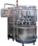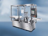 A rotating, 16-head closing unit receives filled syringe bodies and pistons simultaneously. Because air must be vented during the closing process, each syringe is compressed into oval shape briefly, while air is vented at the piston seal. The process does not affect material or syringe properties, and it implements air evacuation under continuous operation. Optima Group Pharma, Green Bay, WI • www.optima-usa.com • tel. 920.339.2222