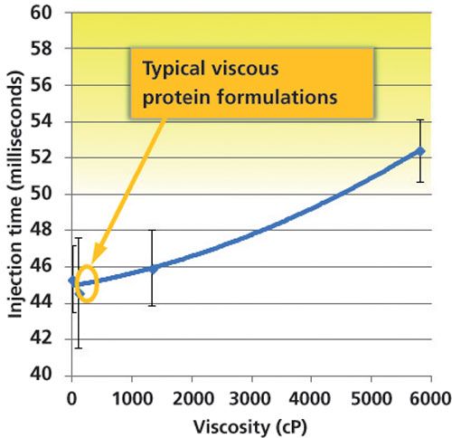 Now consider Humira, a hugely successful product used to treat a range of autoimmune conditions, including rheumatoid arthritis, ankylosing spondylitis, and Crohn’s disease. It has a molecular weight of approximately 148 kDa. Humira (C6428 H9912 N1694 O1987 S46) is 25 times the size of the insulin molecule and is anything but simple. The high mg per mL concentrations of these macromolecule drugs result in high enough viscosities of the injectable product to cause problems for device designers, manufacturers, primary container suppliers, and patients.