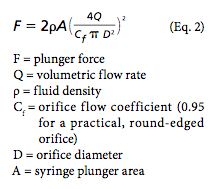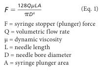 Syringeability refers to the force required to inject a given solution at a given rate via a chosen needle length and gauge. Flow through a hollow needle is characterized by the Hagen-Poiseuille equation: