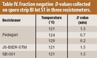 Table IV. Fraction negative D-values collected on spore strip BI lot S1 in three resistometers.