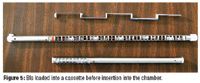 Biological indicators. Three types of BIs—spore strip, self-contained, and glass ampul—from three manufacturers were used (see Table I). Spore-strip BIs consisted of Geobacillus stearothermophilus spores inoculated onto paper carriers and packaged in glassine envelopes. Self-contained BIs consisted of G. stearothermophilus spores inoculated onto paper carriers placed into a thermoplastic vial that serves as a culture tube. A small glass ampul containing sterile culture medium and color indicator also was in the vial. Glass-ampul BIs consisted of G. stearothermophilus spores suspended in liquid culture medium and sealed inside a small, thin-walled, pharmaceutical-grade glass ampul. BIs were loaded into a cassette (see Figure 5) before insertion into the chamber. Upon completion of the cycle, the cassette was removed from the chamber.