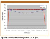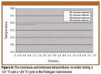 Steris resistometers. Both Steris resistometers operated as described in the ISO standard. The temperature recording from a 121 °C cycle is shown in Figure 8. Fedegari data from Figure 3 also are presented for comparison purposes.