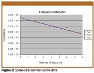 Survivor curve: spore strip. Survivor-curve data collected on the spore-strip lot S1 are shown in Table III. In the Fedegari, D-values were calculated to be 2.7 min in all three trials. In the Steris resistometer, D-values ranged from 2.3 min to 2.8 min (see Figures 9 and 10).