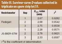 Table III. Survivor-curve D-values collected in triplicate on spore strip lot S1.