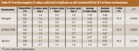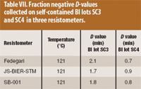 Table VII. Fraction negative D-values collected on self-contained BI lots SC3 and SC4 in three resistometers.
