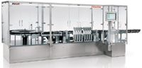 Another highly flexible line can be aseptic or nonaseptic, handles glass or plastic bottles or vials, and can accommodate different filling systems with as many as eight filling heads. Three closing stations can be set up to handle various fittings, stoppers, and cap styles. The system also can incorporate pre- and postfilling gas flushing, empty- and full-container checkweighing with feedback loop, 100% torque measurement, inspection cameras, and labeling. On its maximum fill of 1100 mL, output can reach 120 bottles/min. Changeover takes 15 min (Kugler Linoline, Optima Group).