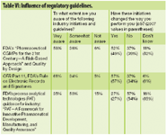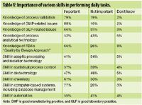 Essential skills and knowledge. Participants provided their opinion of the importance of knowledge and skills in various areas (see Table V). Not surprisingly, knowledge of good manufacturing practice related issues and process validation continue to be most important. What is surprising, however, is the 77% of respondents, a significant increase over last year, who indicated that skills in computer-based systems, including database management was important.