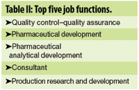 Job description. As in past surveys, the most common field of expertise was in quality assurance and quality control (18%). Expertise in pharmaceutical development (12%), pharmaceutical analytical development (8%), and production research and development (6%) again are included in the top job functions (see Table II). However, "Consultant" (7%) makes the list for the first time, indicating the growing number of pharmaceutical employees who are leaving (voluntarily and otherwise) the corporate arena for self employment.